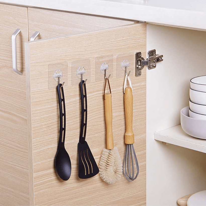 - Móc treo đồ dán tường trong suốt không cần đóng đinh: Sản phẩm này giúp bạn treo dao, thớt, muôi và nhiều vật dụng khác một cách tiện lợi. Với thiết kế trong suốt, nó không chỉ tiết kiệm không gian mà còn tạo vẻ thẩm mỹ cho căn bếp.