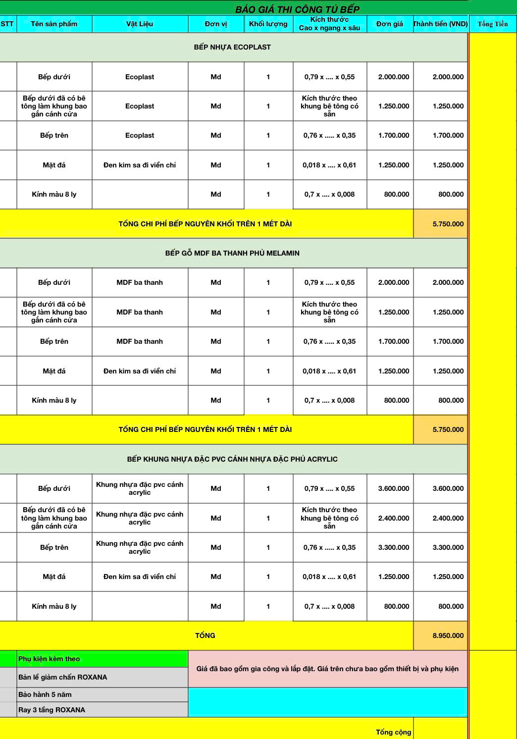 Chất Liệu Thi Công Bếp: